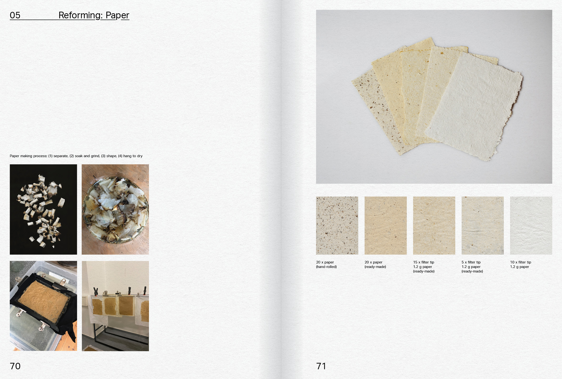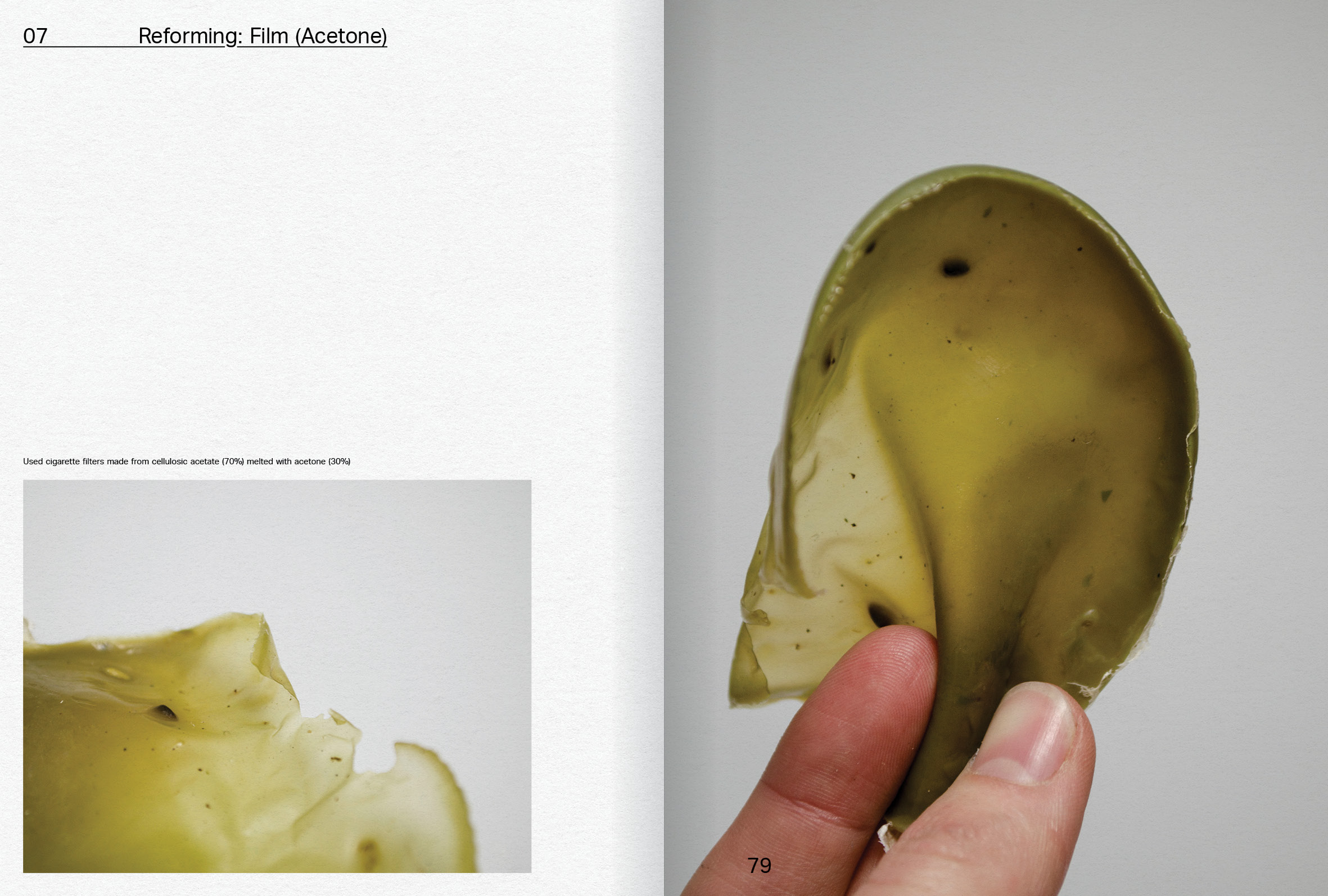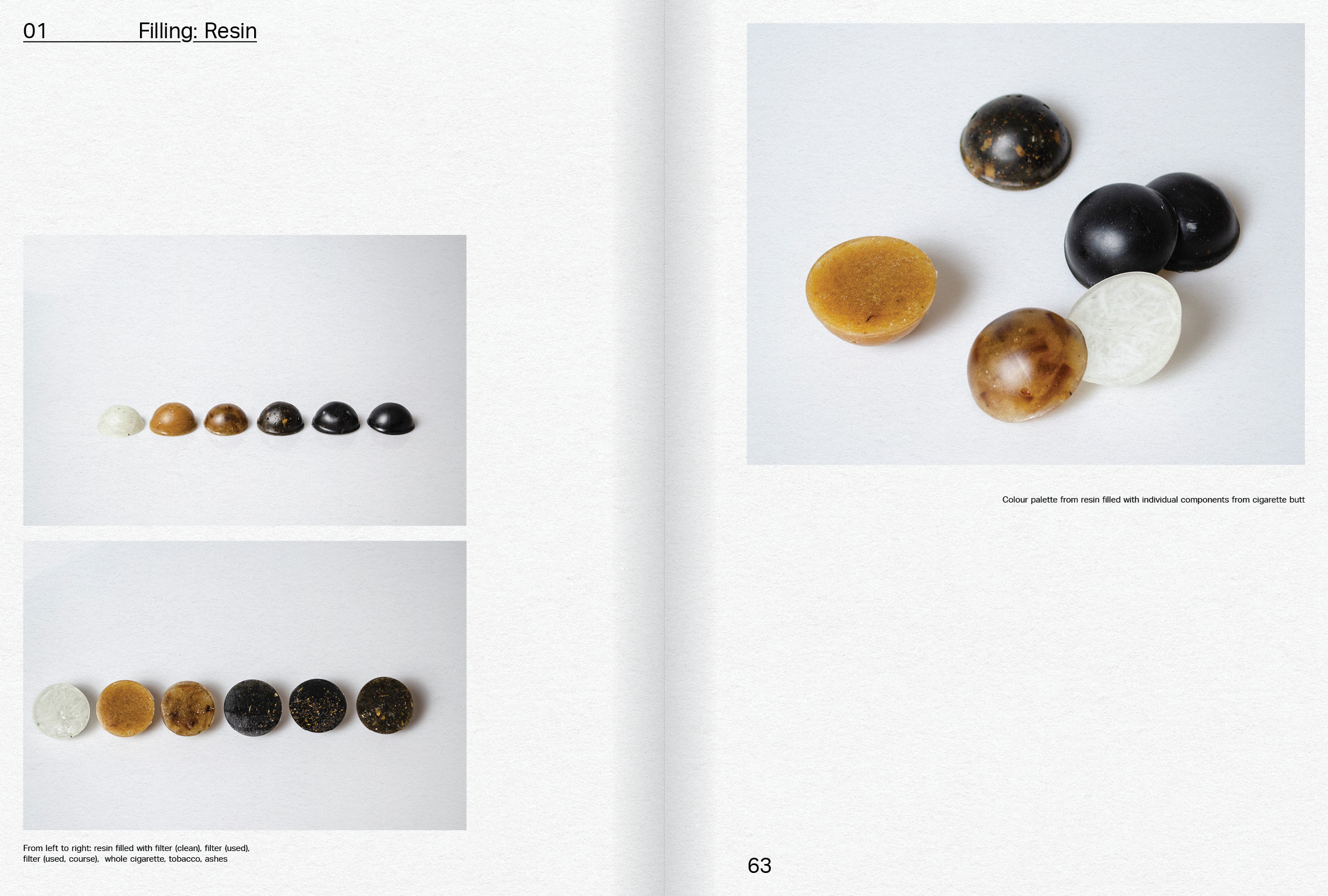 How can discarded cigarette butts be used as a medium to confront us with the impossibility of their recuperation? My master project from my final semester at kunsthochschule berlin weißensee aims to investigate the greenwashing behind recycling and how its concept can tend to justify the production of waste in a consumer-based system. Split into two parts, the first consists of a series of material tests aiming to find beauty in the components present in discarded cigarette butts. The second consists of a final product line and campaign named re:cig ironically advertising this form of recycling.